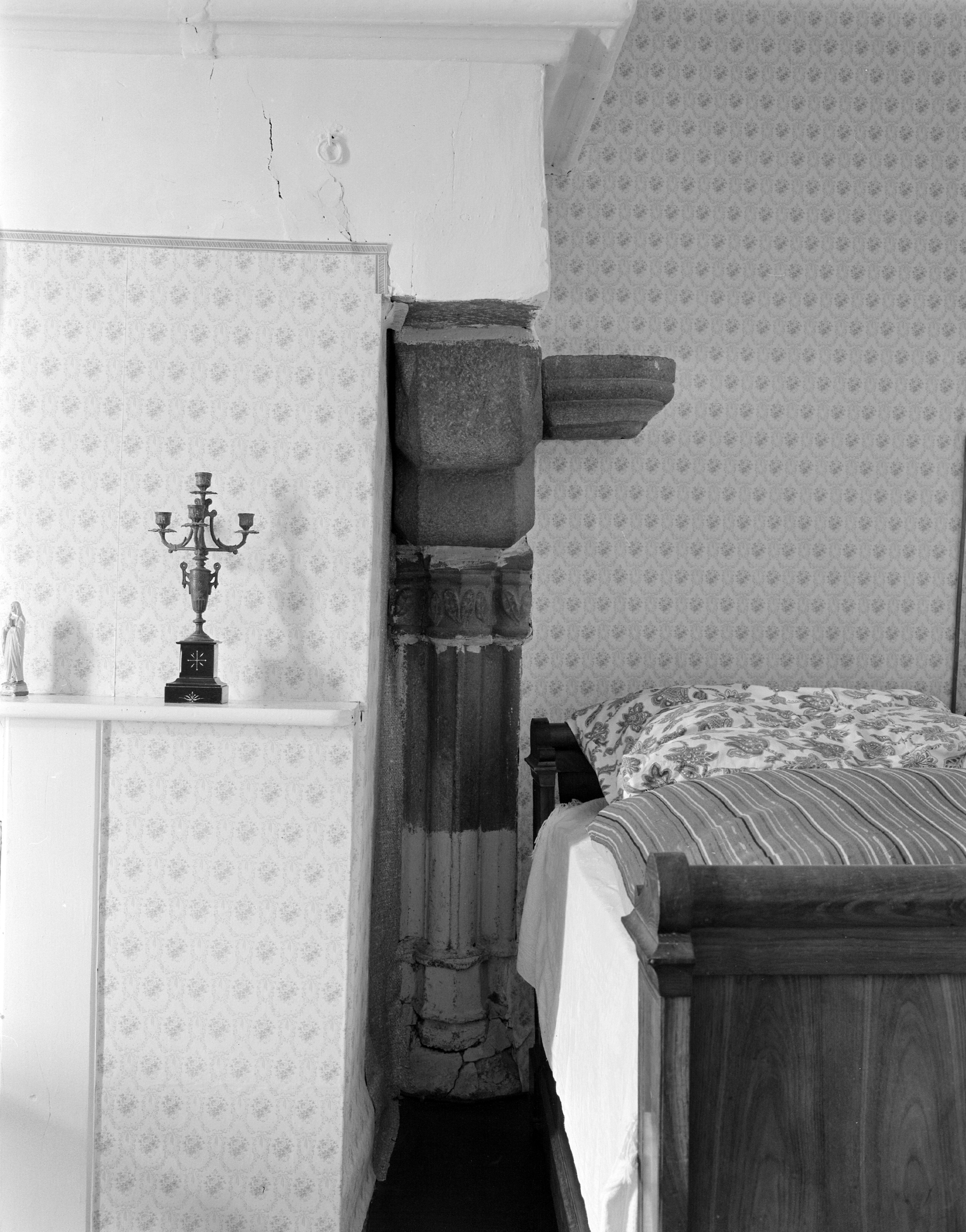 Ploubezre, Le Launay : manoir, pièce sud, vue de détail du piédroit de la cheminée, photographie de 1991Immatriculation