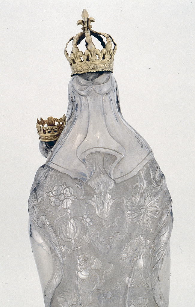 Détail du revers, voile, cheveux et manteau orné.Immatriculation