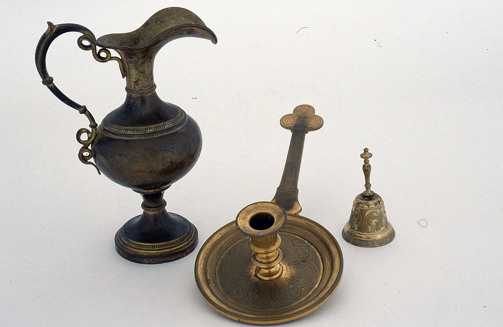 Vue générale de l'aiguière, du bougeopir portatif et de la cloche à main.Immatriculation