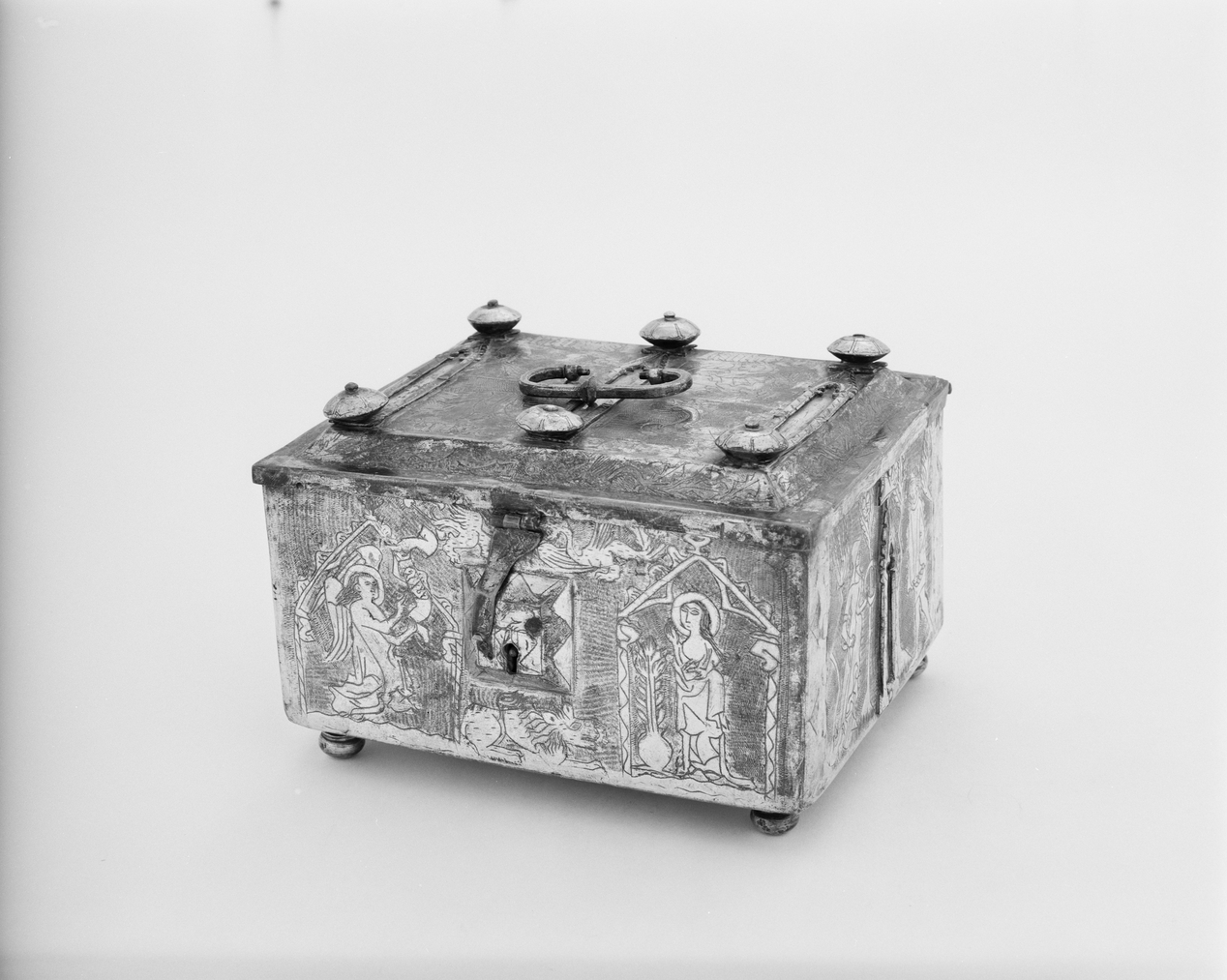 Coffret de mariage, vue générale de trois-quarts, face antérieure au premier plan.(Fonds thématique orfèvrerie de Basse-Bretagne).Immatriculation