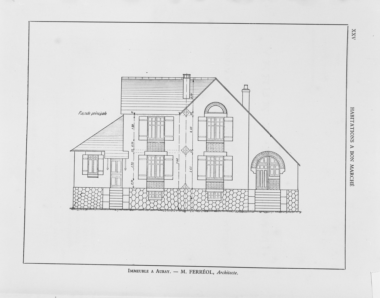 Maison, reproduction du recueil d'architecture, photographie de la planche XXV représentant immeuble à Auray, élévation principale.Immatriculation