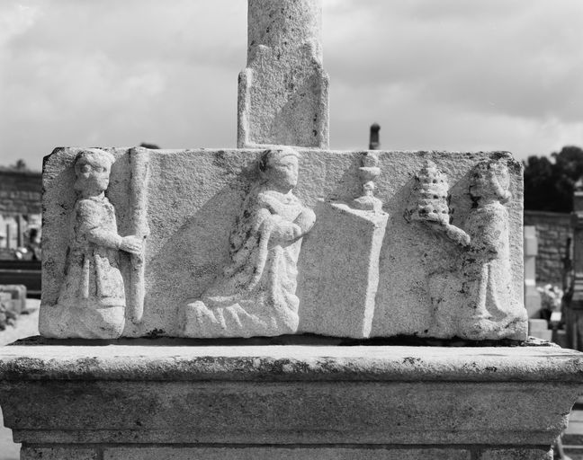 Croix de cimetière, socle vu de face : la Messe de saint GrégoireImmatriculation