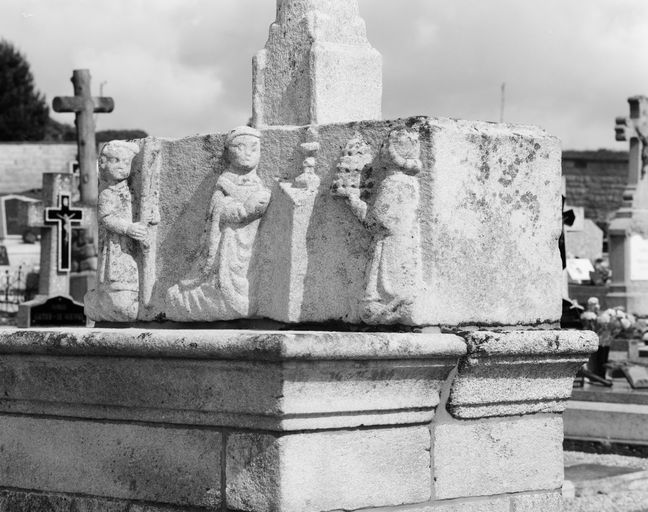Croix de cimetière, socle vu de 3/4 : la Messe de saint GrégoireImmatriculation