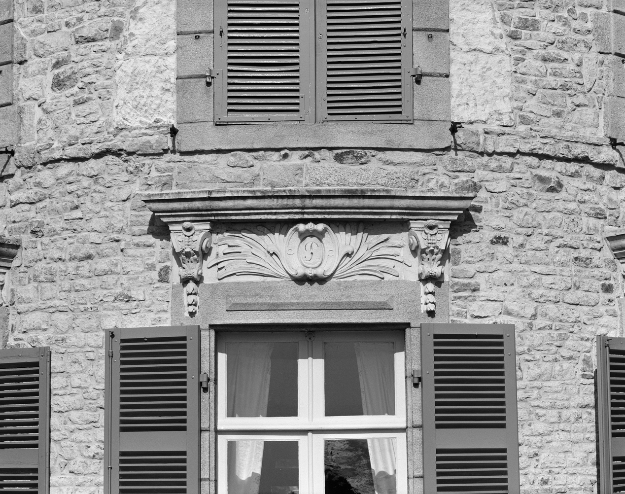 Elévation est, porte centrale, linteau.Immatriculation
