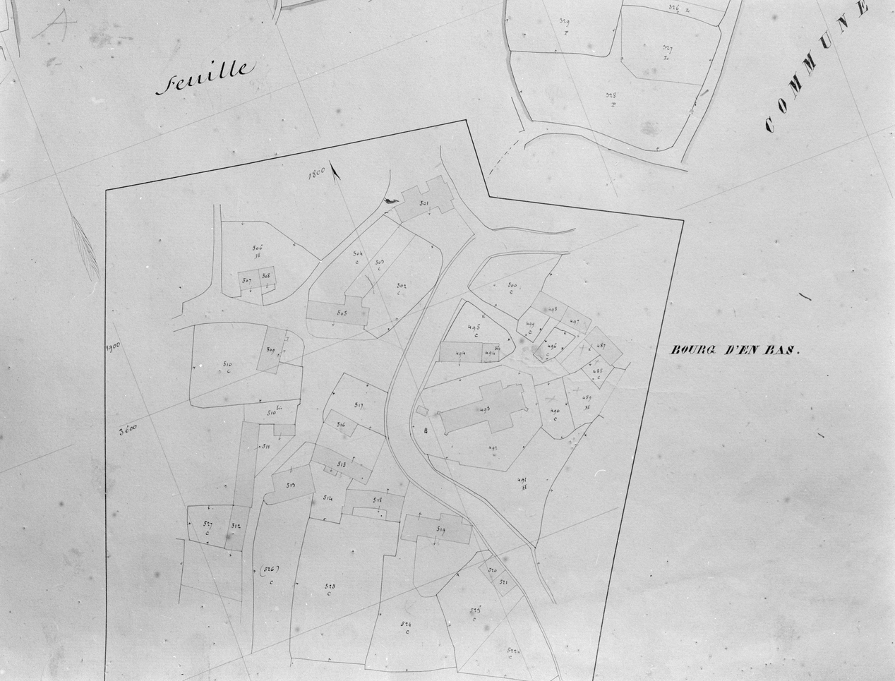 Extrait cadastral de 1844, partie est (Bourg d'en Bas), section D2.Immatriculation