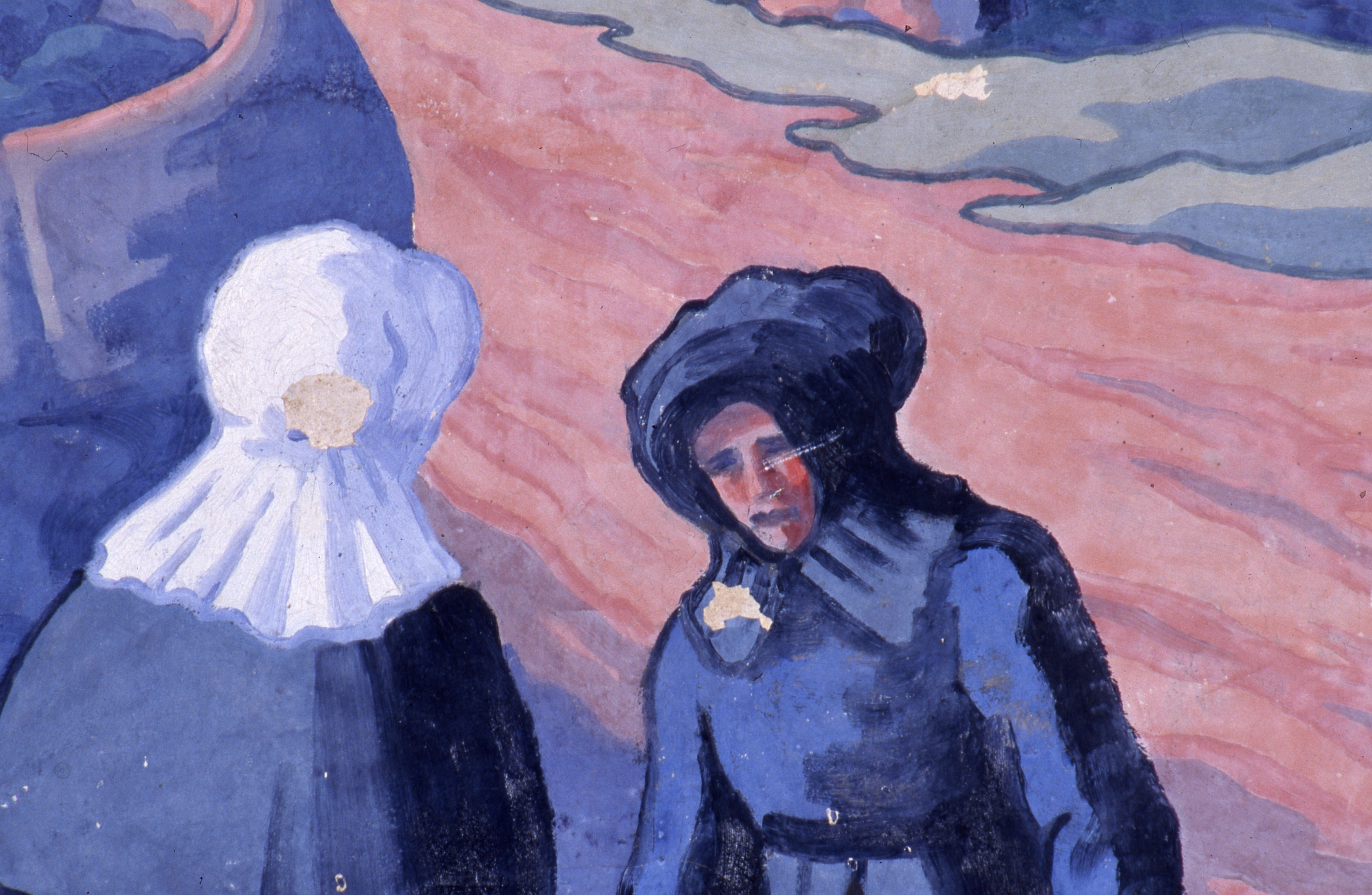 Panneau n°6 : femmes debout en bas de la scène, détail.Immatriculation