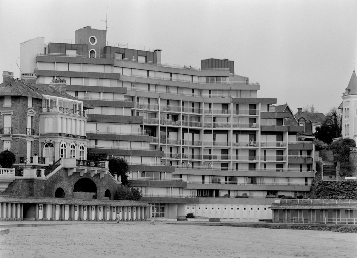 Immeuble construit à l'emplacement de l'Hôtel Crystal. Vue d'ensemble de la façade sur mer.Immatriculation