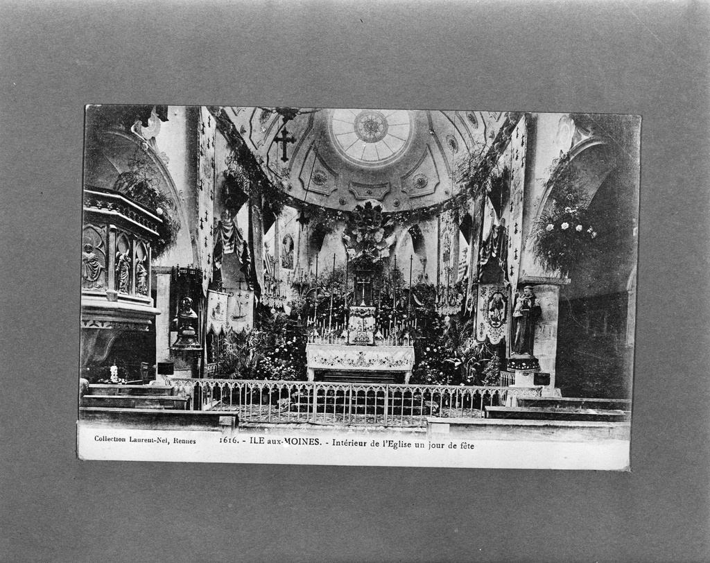 Intérieur de l'église. Carte postale ancienne, coll. Laurent Nel Rennes. (Doc. A.D. Morbihan).Immatriculation