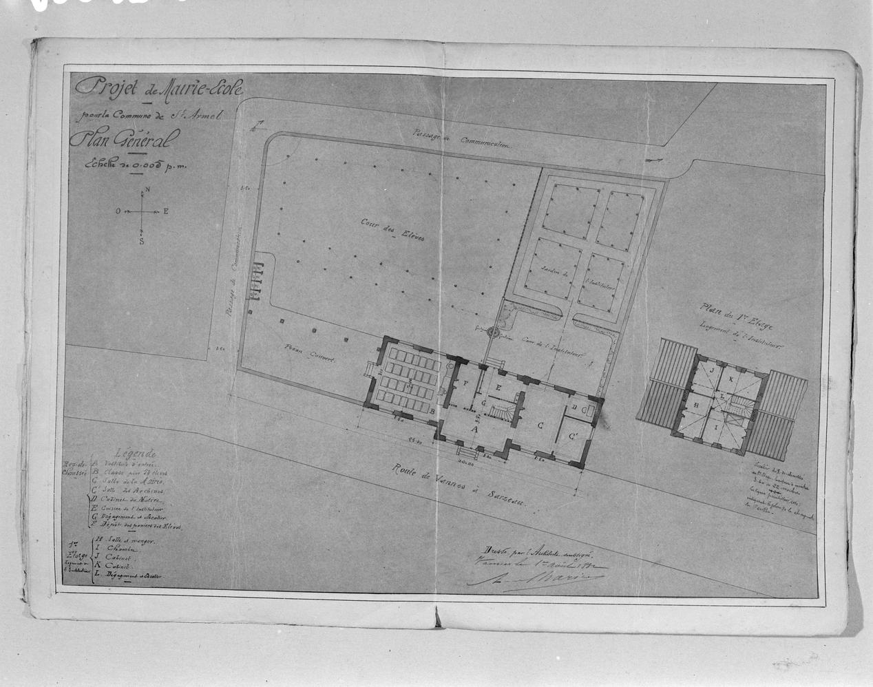 Projet de mairie-école, élévation par Charier, 1882 (Doc. A.D. Morbihan).Immatriculation