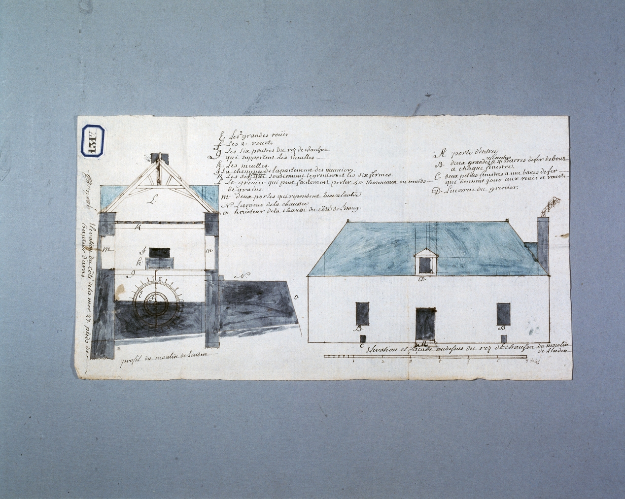 Le Linden, moulin de Linden, élévation et profil, dessin 131-17. (Archives Départementales Vannes).Immatriculation