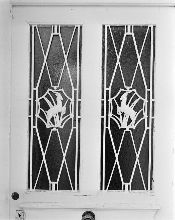 Le Ruaud : élévation sud, détail grille de la porte.Immatriculation