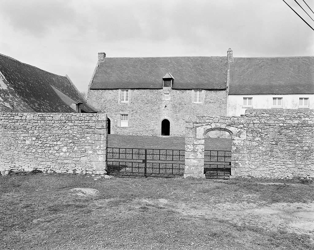 Manoir, vue générale de l'élévation sud avec mur de clôture et dépendances.Immatriculation