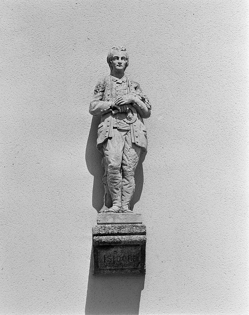 Logis, élévation sud : statue de saint Isidore.Immatriculation