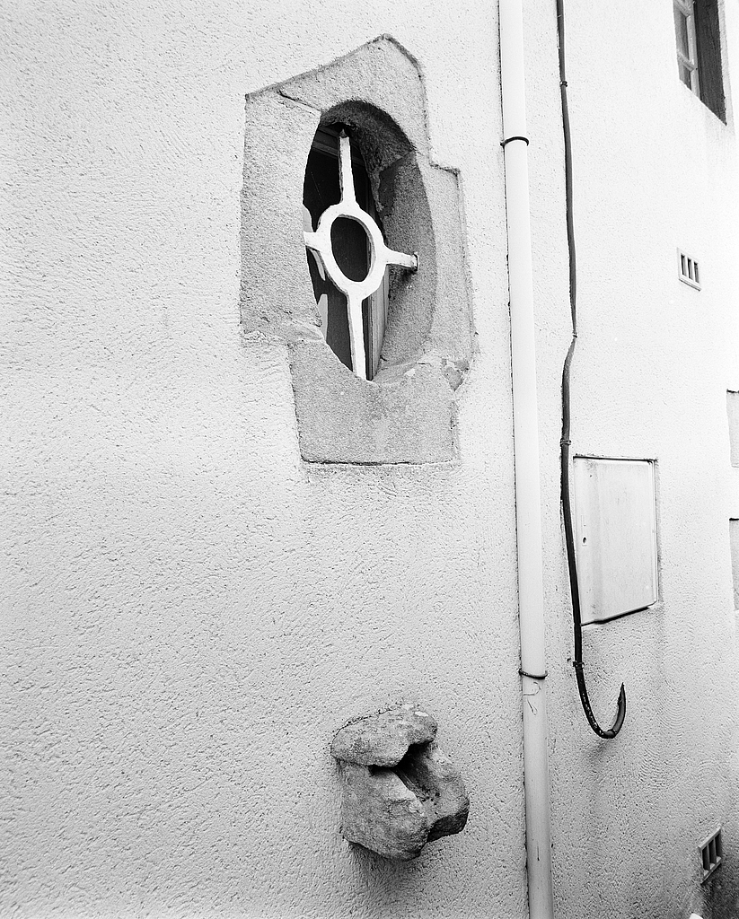 Manoir presbytère, pignon nord : oculus et évacuation d'évier.Immatriculation