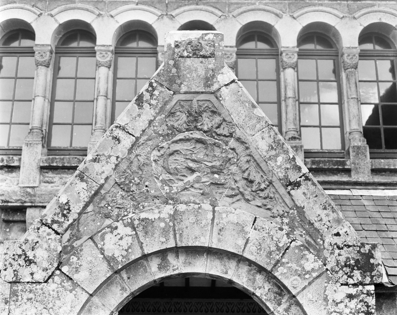 Porche nord, détail du tympan en grès émaillé.Immatriculation