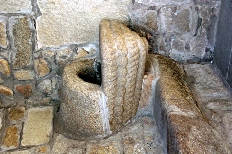 Bénitier du porche sud : vue rapprochée.Immatriculation