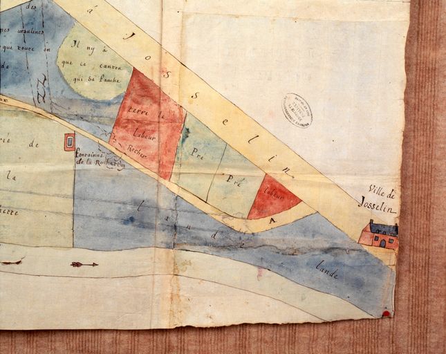 A. D. Ille-et-Vilaine. Série C 730/1. Plan du chemin de Josselin à Pontivy et plan par cultures jusqu'aux bords de l'Oust. Dessin, [s. n.], 1770. Papier, encre, aquarelle.