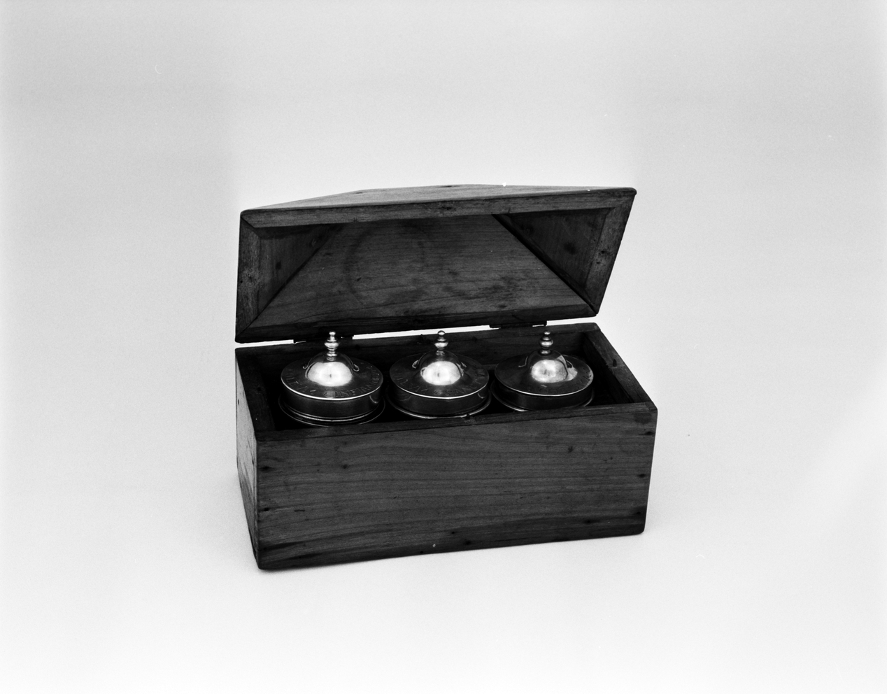 Vue générale des boîtes dans un coffret de bois. (Fonds thématique orfèvrerie de Basse-Bretagne (56), vol. 1).Immatriculation