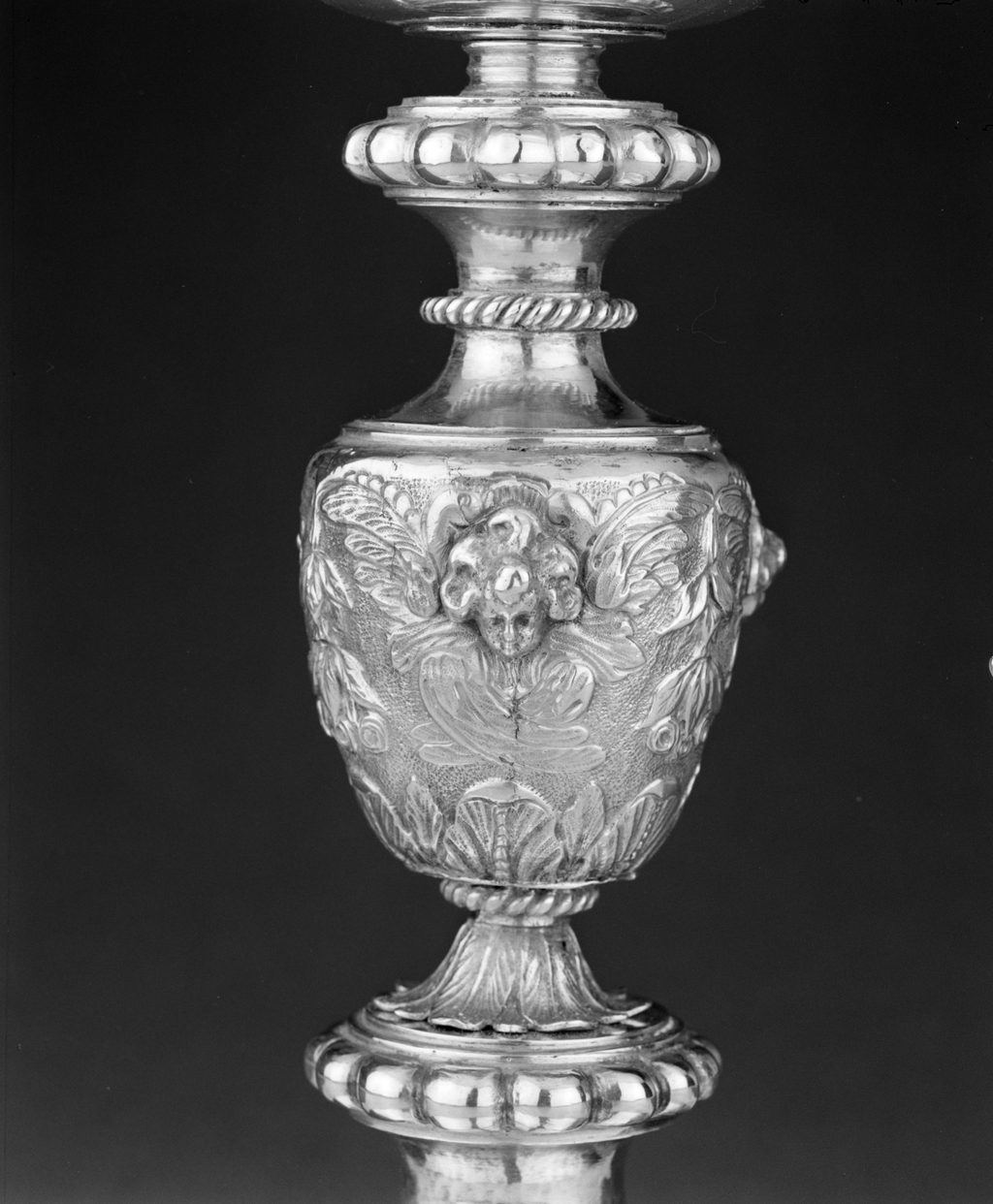 PLUMERGAT, église paroissiale Saint-Thuriau, calice et patène n°2, calice : détail du noeud. (Fonds thématique orfèvrerie de Basse-Bretagne (56), vol.3).Immatriculation