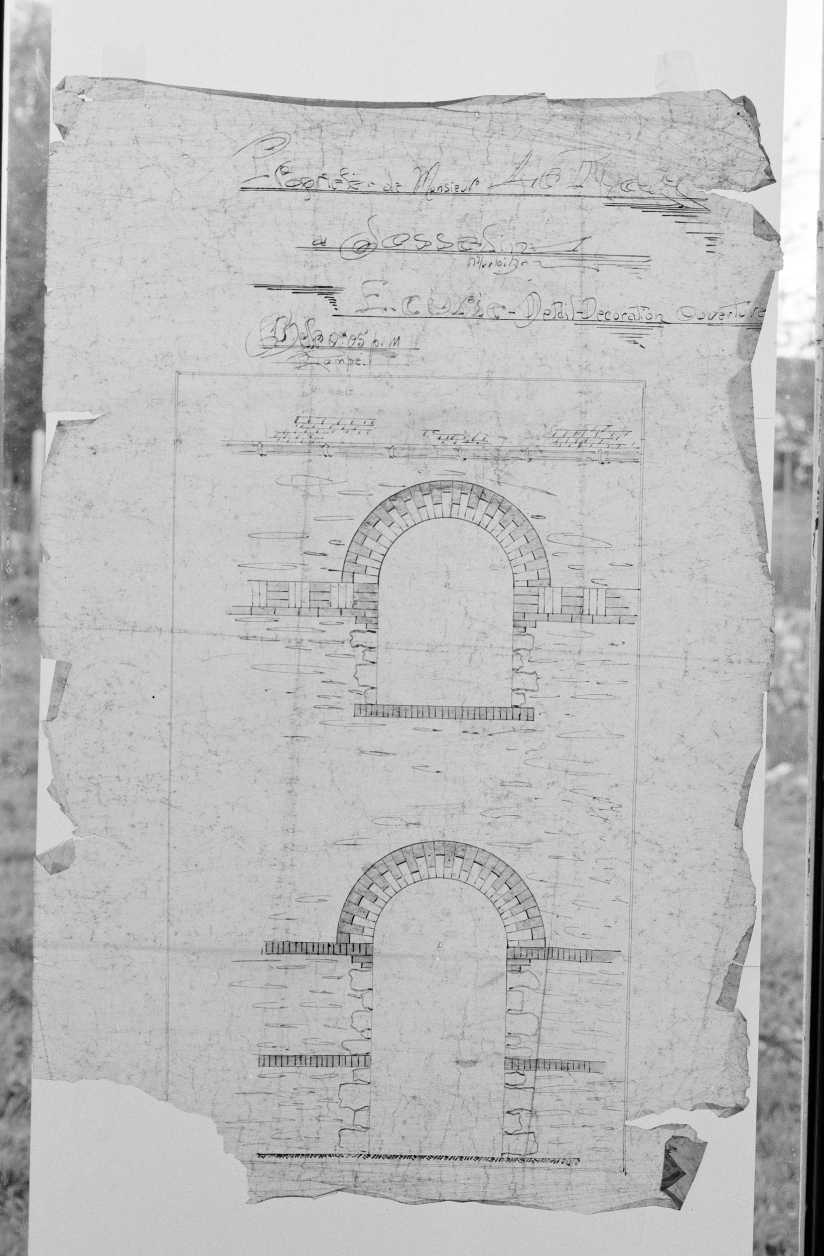 Propriété de M. Le Ray à Josselin. Écurie - Détail décoration ouvertures. Dessin par Pompéi, Concoret, 1929, échelle 1:100e.