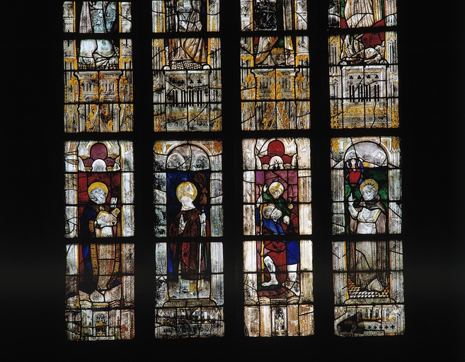 Verrière à personnages de la baie 10, partie inférieure : saint Pierre, saint abbé, saint Christophe, saint Vincent Ferrier (état en 1994)Immatriculation