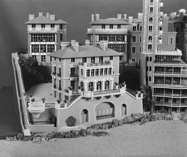 Crystal Hôtel, vers 1920, vue rapprochée de la partie gauche de l'hôtel sur front de mer (maquette d'André Pompanon, Musée de Dinard).Immatriculation