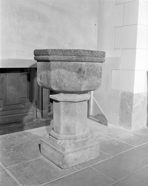 Bénitier, fonts baptismaux, église paroissiale Saint-Melaine (Cornillé),