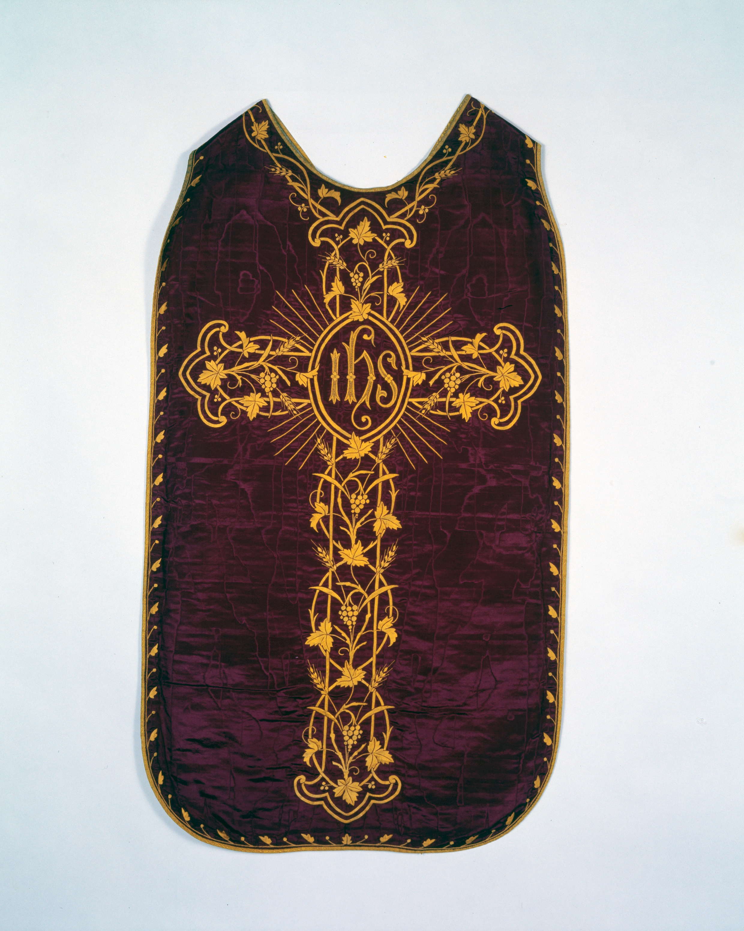 Ornement réversible blanc et rouge 1 : chasuble, bourse de corporal, étole, manipule, basilique Notre-Dame-du-Roncier (Josselin),