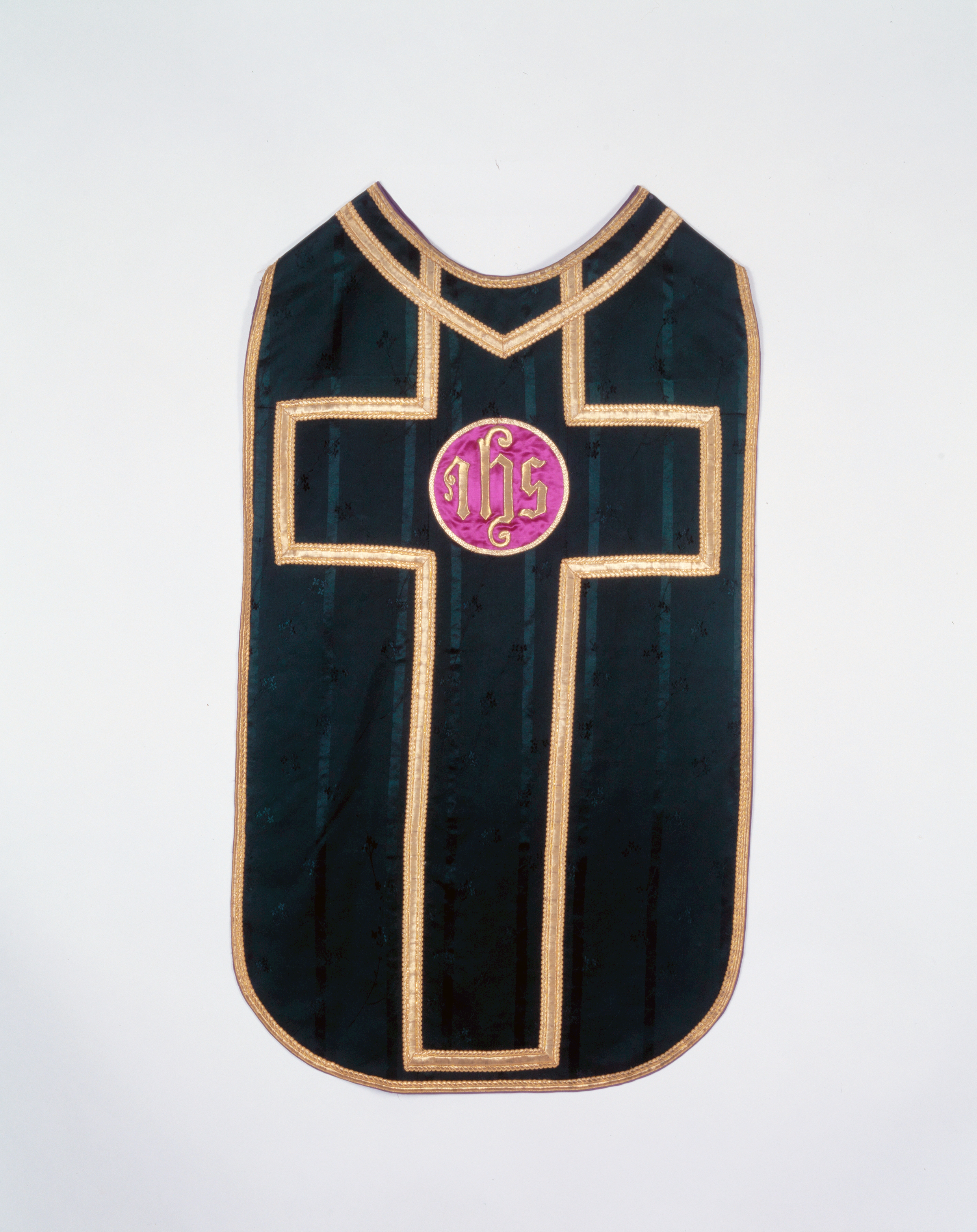 Ornement vert 1 : chasuble, bourse de corporal, étole, voile de calice, basilique Notre-Dame-du-Roncier (Josselin),
