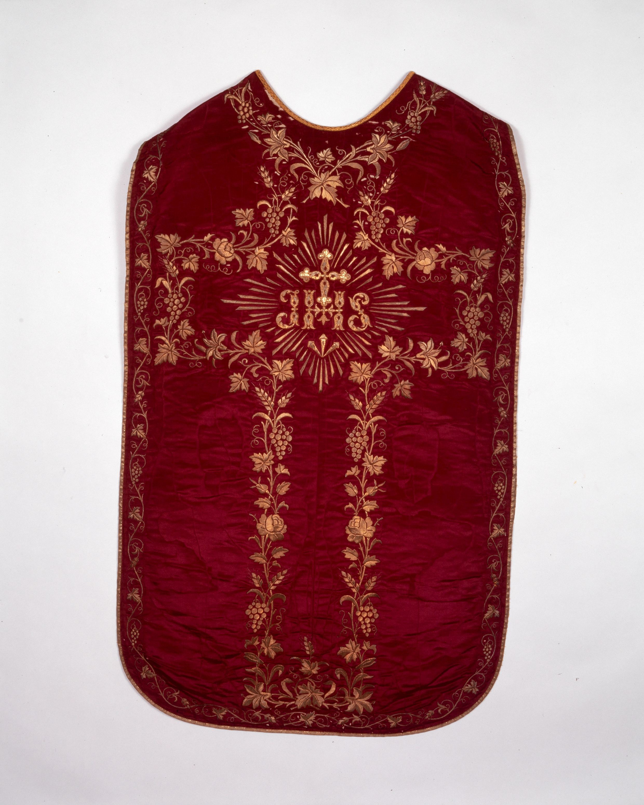 Ornement réversible blanc et rouge 2 : chasuble, bourse de corporal, étole, manipule, voile de calice, basilique Notre-Dame-du-Roncier (Josselin),