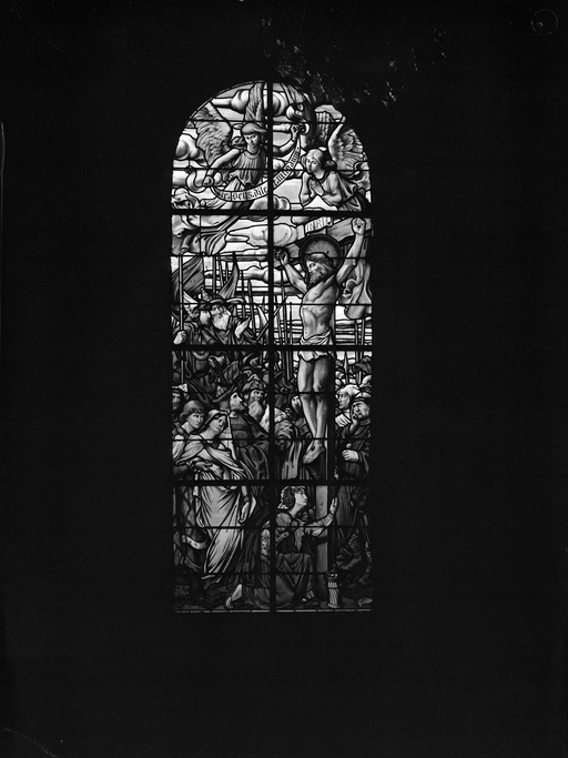 Verrière du choeur, mur nord : Crucifixion, Cène (baies n°1 et 2), vue générale.Immatriculation