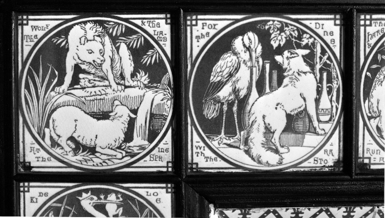 Détail du décor céramique n°1 de cheminée de la chambre 1, rez-de-chaussée.Immatriculation