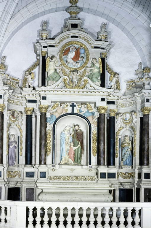 Retable, autel, groupe sculpté, haut-relief, statue (2, autel secondaire, retable architecturé) : sainte Christine, sainte Germaine, sainte Famille, église paroissiale Saint-Pierre (Coësmes),