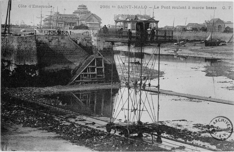 Carte postale ancienne du pont roulant à marée basse. Archives départementales d'Ille-et-Vilaine. 6Fi