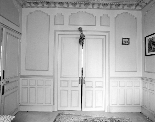 Vue générale de la porte avec lambris et corniche dans le salon.Immatriculation