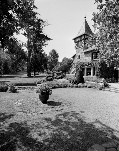 Vue de la partie sud-ouest de la façade avec tour et vue sur le jardin.Immatriculation