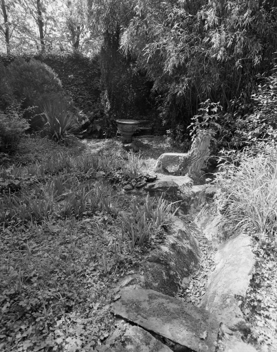 Vue général du jardin japonais avec le banc et la vasque.Immatriculation