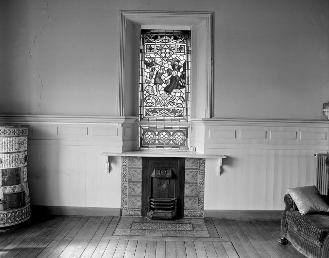 Vue générale de la cheminée avec vitrail dans le petit salon.Immatriculation
