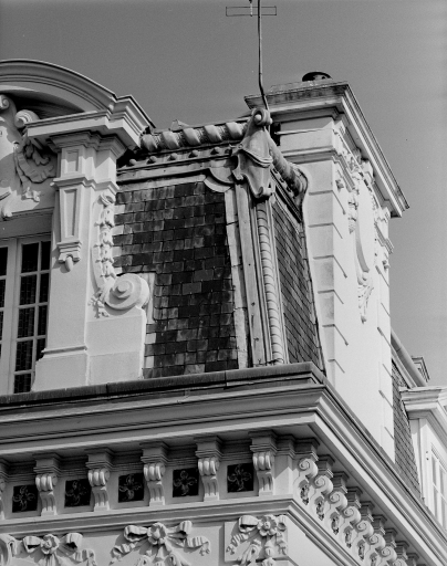 Détail céramique et sculpture de l'angle supérieur droit de la façade principale.Immatriculation