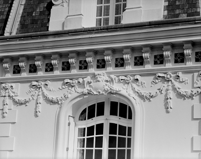 Détail céramique et sculpture sur façade principale.Immatriculation