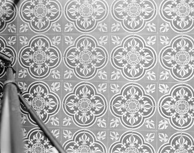 Rez-de-chaussée, hall : détail du carrelage.Immatriculation