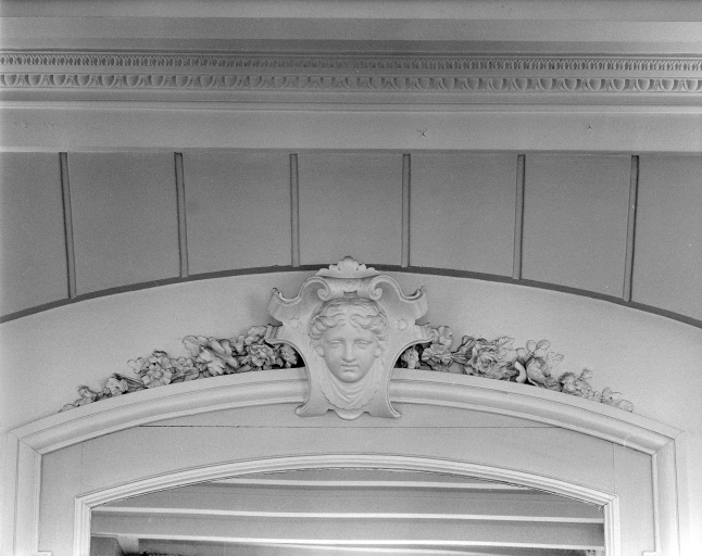 Vue générale d'un blason au-dessus d'une ouverture de porte dans le hall-salon.Immatriculation