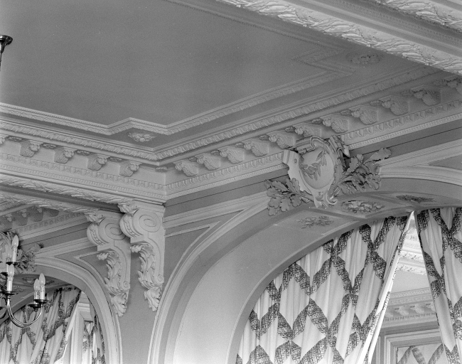 Détail des corniches moulurées angle du plafond du restaurant, au-dessus de l'ouverture cintrée.Immatriculation