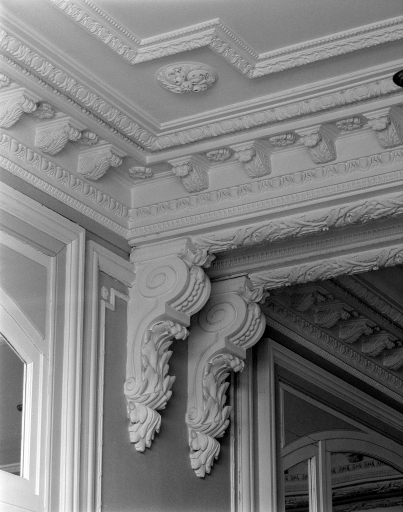 Détail des corniches moulurées angle du plafond du restaurant.Immatriculation
