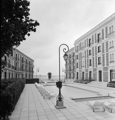 Vue générale de la piscine avec vue des bâtiments A et B et vue de la mer au centre.Immatriculation