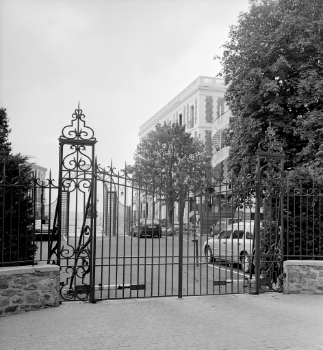 Vue générale du portail d'entrée en ferronnerie de l'hôtel.Immatriculation