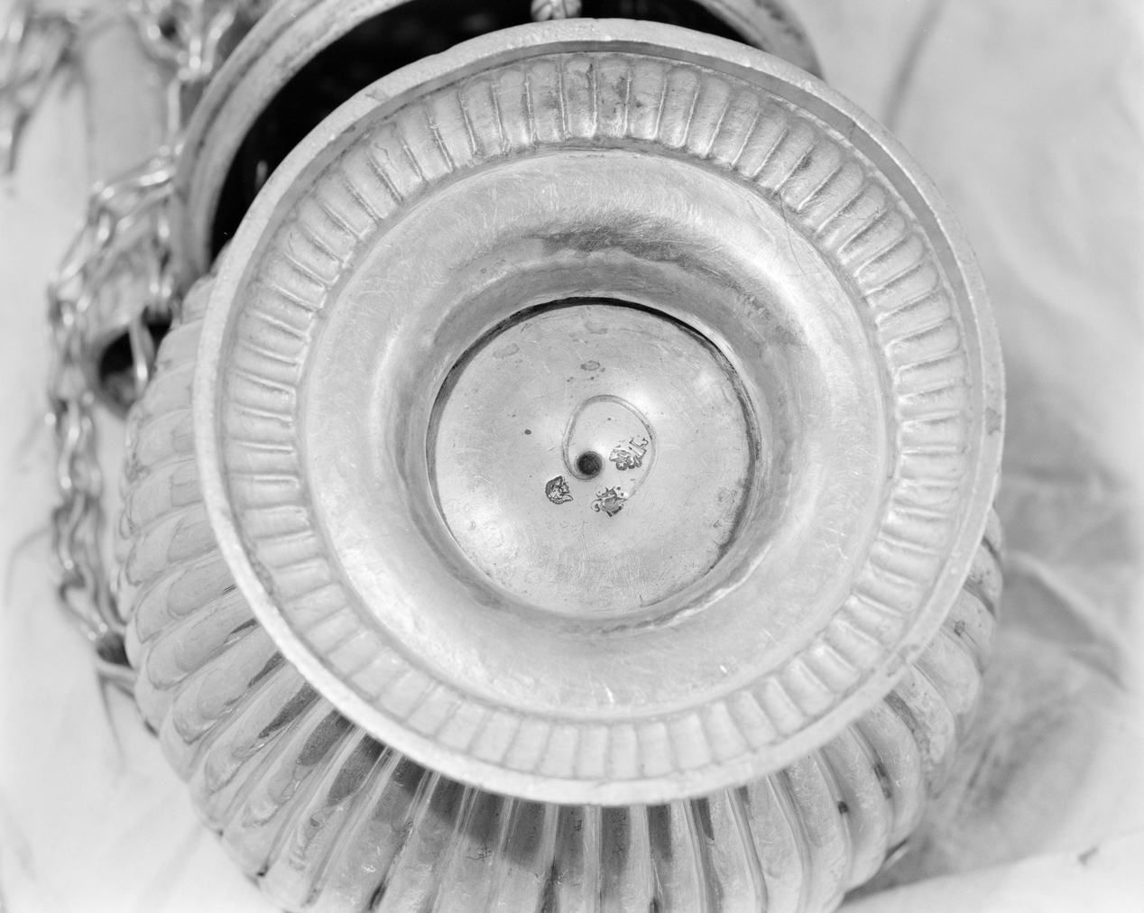 Encensoir, détail des poinçons sous le pied.Immatriculation