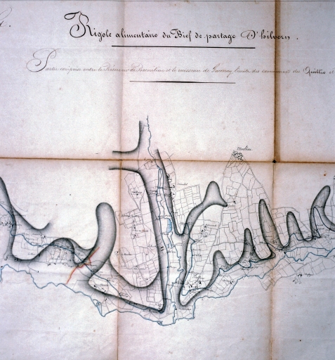 Département des Côtes-du-Nord. Canal de Nantes à Brest. Rigole alimentaire du bief de partage d'Hilvern. Partie comprise entre le réservoir de Bosméléac et le ruisseau de Guernay, limite des communes du Quillo et St-Caradec. Carte [=carte 1], par Faivre, conducteur faisant office d'ingénieur ordinaire des Ponts et chaussées, 22 janvier 1844, échelle : 1 : 10000. Papier, encre, aquarelle.