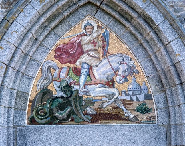 Tympan (décor d'élévation extérieure) : Saint Georges terrassant le dragon, église paroissiale Saint-Georges (Châtillon-en-Vendelais),