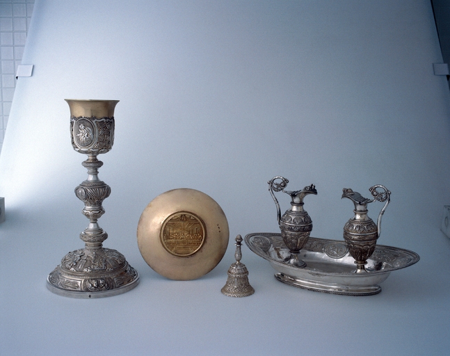 Calice, patène, clochette, bassin à burettes, burettes (chapelle), église paroissiale Saint-Pierre, Saint-Paul (Montreuil-sous-Pérouse),